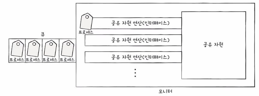 ์ํธ ๋ฐฐ์ ๋ฅผ ์ํ ๋๊ธฐํ ์ธก๋ฉด์์๋ ๊ณต์ ์์๊ณผ ๊ณต์ ์์์ ์ ๊ทผํ๊ธฐ ์ํ ์ธํฐํ์ด์ค๋ฅผ ๋ฌถ์ด์ ๊ด๋ฆฌํฉ๋๋ค. ๊ณต์ ์์์ ์ ๊ทผํ๊ณ ์ ํ๋ ํ๋ก์ธ์ค๋ฅผ ํ๋ฅผ ๋ง๋ค๊ณ ๋ชจ๋ํฐ ์์ ํญ์ ํ๋์ ํ๋ก์ธ์ค๋ง ๋ค์ด์ค๋๋ก ํ์ฌ ์ํธ ๋ฐฐ์ ๋ฅผ ์ํ ๋๊ธฐํ๋ฅผ ์ ๊ณตํฉ๋๋ค.