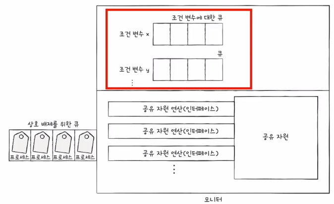 ์ํธ ๋ฐฐ์ ๋ฅผ ์ํ ํ์ ์กฐ๊ฑด ๋ณ์์ ๋ํ ํ๋ ์๋ก ๋ค๋ฅธ ํ์ ๋๋ค. ๋ชจ๋ํฐ์์๋ ์กฐ๊ฑด ๋ณ์๋ฅผ ํ์ฉํ์ฌ ํ๋ก์ธ์ค๋ ์ค๋ ๋์ ์คํ ์์๋ฅผ ์ ์ดํ ์ ์์ต๋๋ค. ์กฐ๊ฑด ๋ณ์๋ wait๊ณผ signalํจ์๋ฅผ ์ ๊ณตํ๋ฉฐ ์ค๋น์ํ์์ ๋๊ธฐํ๊ฑฐ๋ ์คํ์ํ๋ก ์ ํํ๋ ๊ธฐ๋ฅ์ ๋๋ค.