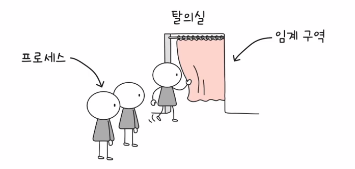 ์ ๋ฆฌํ๋ฉด ๋ฎคํ ์ค ๋ฝ์ ์ํธ ๋ฐฐ์ ๋ฅผ ์ํ ๋๊ธฐํ ๋๊ตฌ๋ก์จ ํ์์ค์ ์ค์น๋ ์๋ฌผ์ ๋ผ๊ณ ๋ณด์๋ฉด ๋ ๊ฒ ๊ฐ์ต๋๋ค. ํ์์ค์๋ ์๋ ํ ๋ช ์ฉ๋ง ๋ค์ด๊ฐ๊ธฐ ๋๋ฌธ์ ์๋์ด ํ์์ค์ ์ด์ฉํ๋ฉด ์๋ฌผ์ ๋ฅผ ์ ๊ทธ๊ณ ๋ค๋ฅธ ์๋๋ค์ ๊ธฐ๋ค๋ฆฝ๋๋ค. ํ์์ค ๋ฐ ์๋๋ค(๋๊ธฐํ๋ ํ๋ก์ธ์ค)์ ๊ฑธ๋ ค์๋ ์๋ฌผ์ (๋ฎคํ ์ค ๋ฝ)๋ฅผ ๋ณด๊ณ ํ์์ค(์๊ณ ์์ญ)์ ๋ค์ด๊ฐ์ง ์์ต๋๋ค.