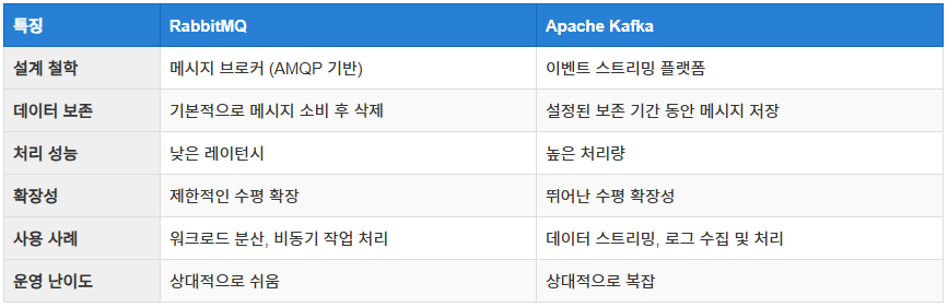 RabbitMQ์ Kafka๋ ๋ ๋ค ๋ฉ์์ง ์์คํ ์ด์ง๋ง, ์ค๊ณ ์ฒ ํ๊ณผ ์ฃผ์ ์ฌ์ฉ ์ฌ๋ก์์ ์ฐจ์ด๊ฐ ์์ต๋๋ค. ์๋๋ RabbitMQ์ Kafka์ ์ฃผ์ ์ฐจ์ด์ ์ ๋๋ค.