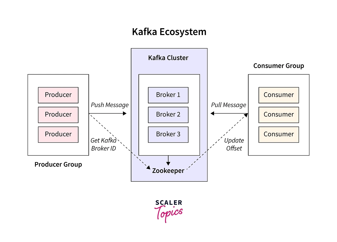 - Producer → Topic → Partition → Consumer Group