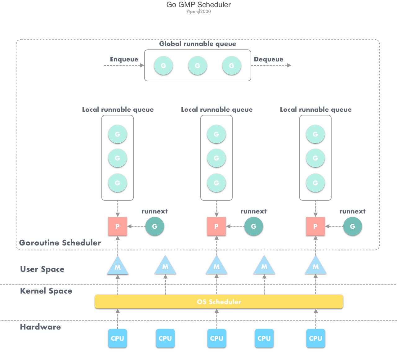 G๋ ๋ ๋ฆฝ์ ์ธ ์คํ ๊ฒฝ๋ก์ ์คํ์ ๊ฐ์ง๋ฉฐ M์ ์ํด ์คํ๋ฉ๋๋ค. M์ ์ฐ๋ฆฌ๊ฐ ์๋ OS thread์ ๋๋ค. P๋ ๋ก์ปฌ ์ค์ผ์ค๋ฌ ์ญํ ์ ํ๋ ๊ตฌ์กฐ์ฒด๋ก, ์คํํ ๊ณ ๋ฃจํด ๋ชฉ๋ก์ ๊ด๋ฆฌํ๊ณ M์๊ฒ ๊ณ ๋ฃจํด์ ์ ๊ณตํฉ๋๋ค. ์์คํ ์ ๊ฐ CPU์ฝ์ด์๋ ํ๋์ P๊ฐ ํ ๋น๋ฉ๋๋ค.