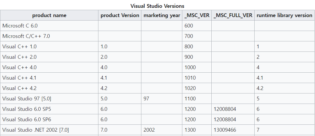 ์๋๋ Visual Studio ๋ฒ์ ์ ์ปดํ์ผ๋ฌ ๋ฒ์ ํ ์ด๋ธ์ ์๊ฐํ๋ ์ํค์ด๋ค.